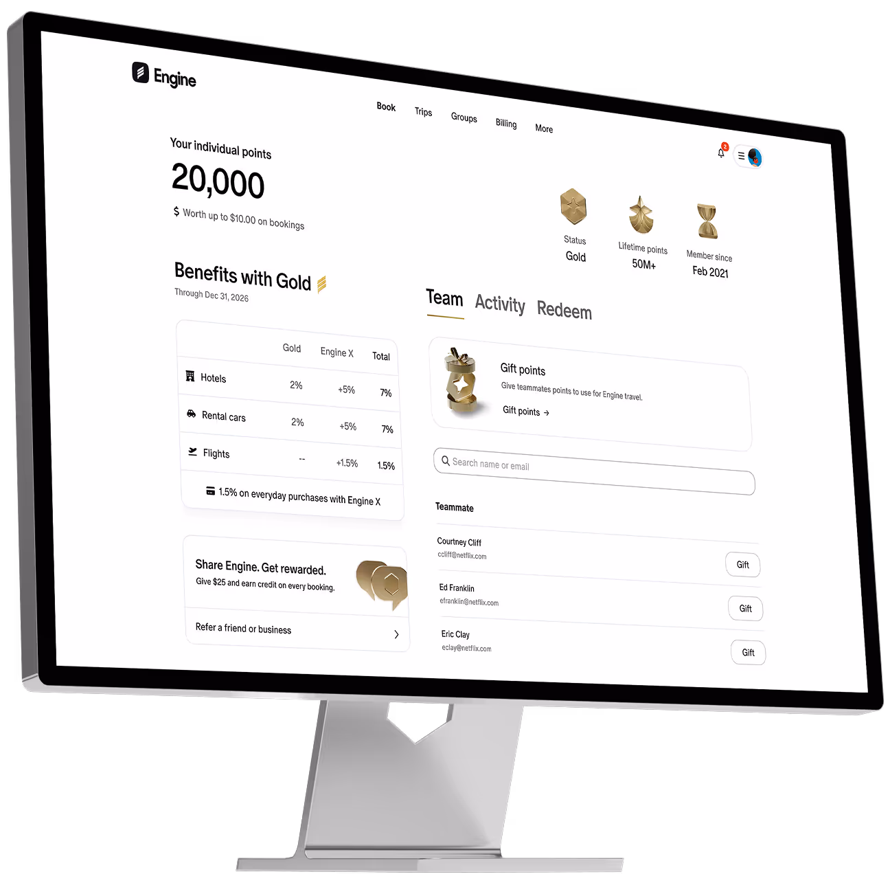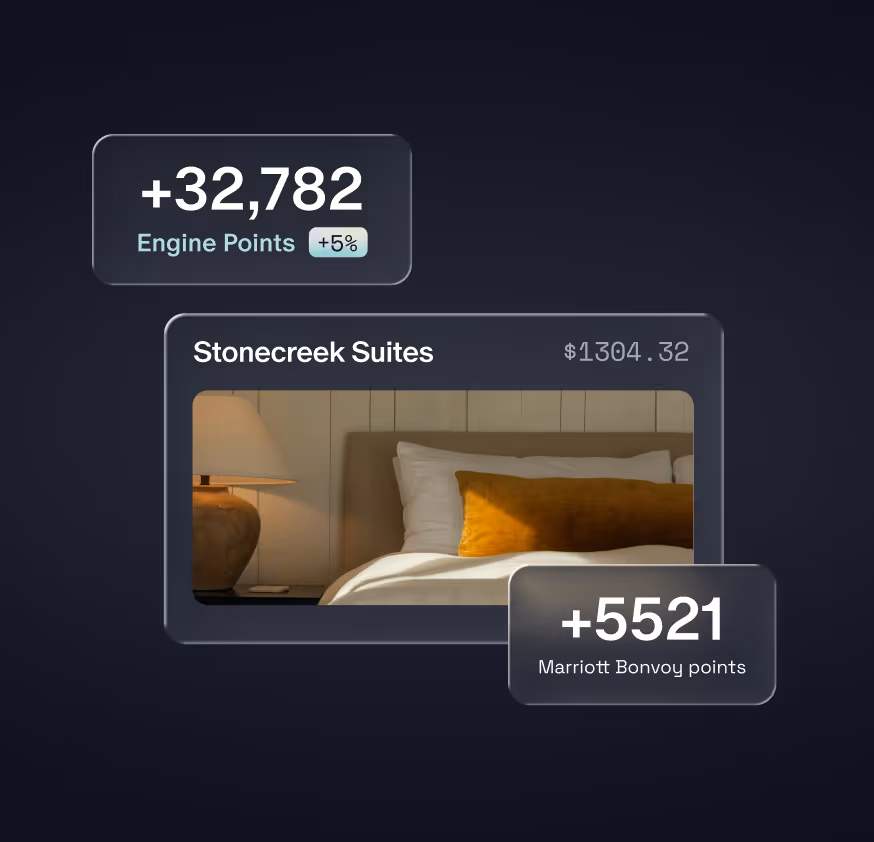 Points are earned on eligible hotel and car bookings made through Engine, based on the pre-tax subtotal. Some bookings or payment types may not qualify.